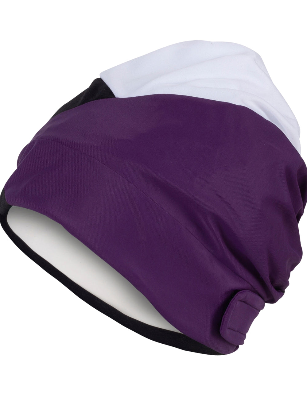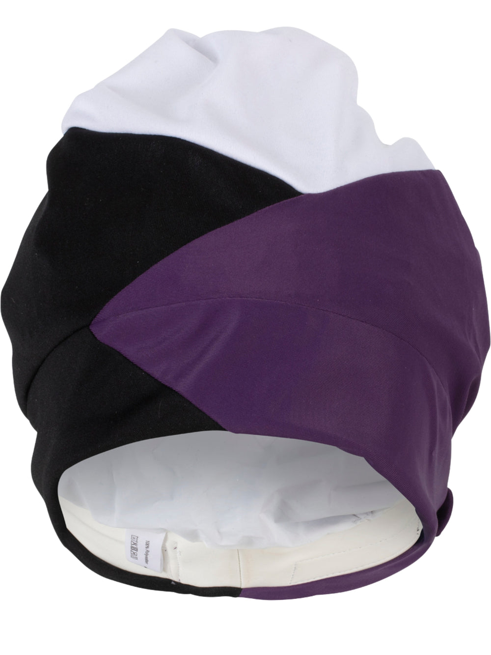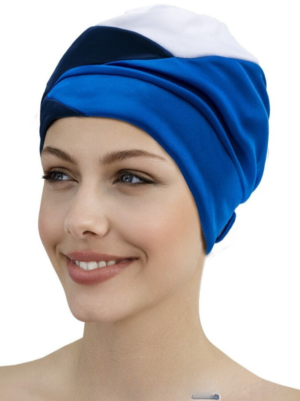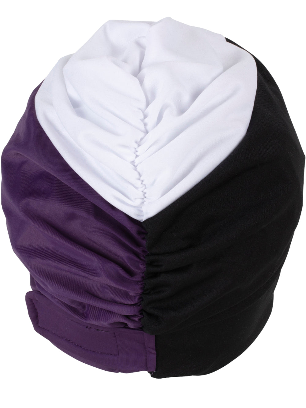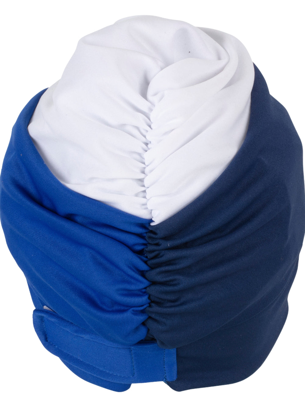 The Tri-Colour Fabric Swim Cap from Fashy is an exclusive turban cap designed with tri-tone panel details for a chic vintage look. The smooth rubber grip band provides a comfortable but secure fit and helps cover your ears and there is a velcro closure at the back of the cap for a perfect fit. It is also suitable for long hair with extra internal space.