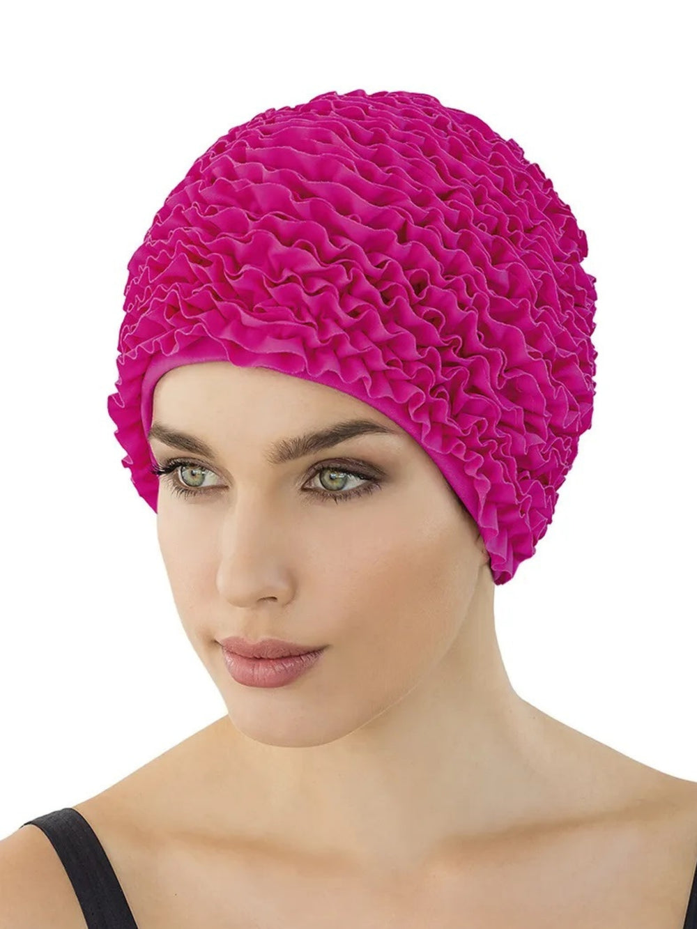The Frill Fabric Swim Cap from Fashy features beautiful frills all over the cap. The swimming cap offers a comfortable smooth rubber grip band that covers your ears. With a plastic lining, it is great to keep you warm while swimming, for wearing to spa's or as a stylish cover up post surgery.